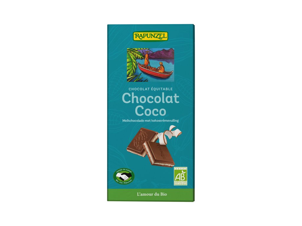 ZLOŽENIE: sušená trstinová šťava rapadura, prírodný trstinový cukor, kakaové maslo, sušené plnotučné mlieko 19%, kokos 9%, kakaová hmota, emulgátor: slnečnicový lecitín, Bourbon vanilka. Všetky zložky pochádzajú z kontrolovaného ekologického poľnohospodárstva. Obsah kakaovej sušiny najmenej 36% v čokoláde.