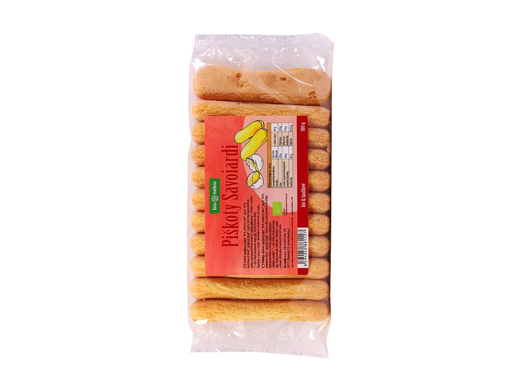ZLOŽENIE: špaldová múka* 30%, trstinový cukor*, vajcia* 26%, zemiaková múčka*, pšeničný škrob*, mliečne bielkoviny*, kypriace látky: hydrogénuhličitan sodný, hydrogénuhličitan amónny, prírodná aróma*. Rastlinný olej bol použitý na vymazanie plechov. Suroviny s * pochádzajú z kontrolovaného ekologického poľnohospodárstva.